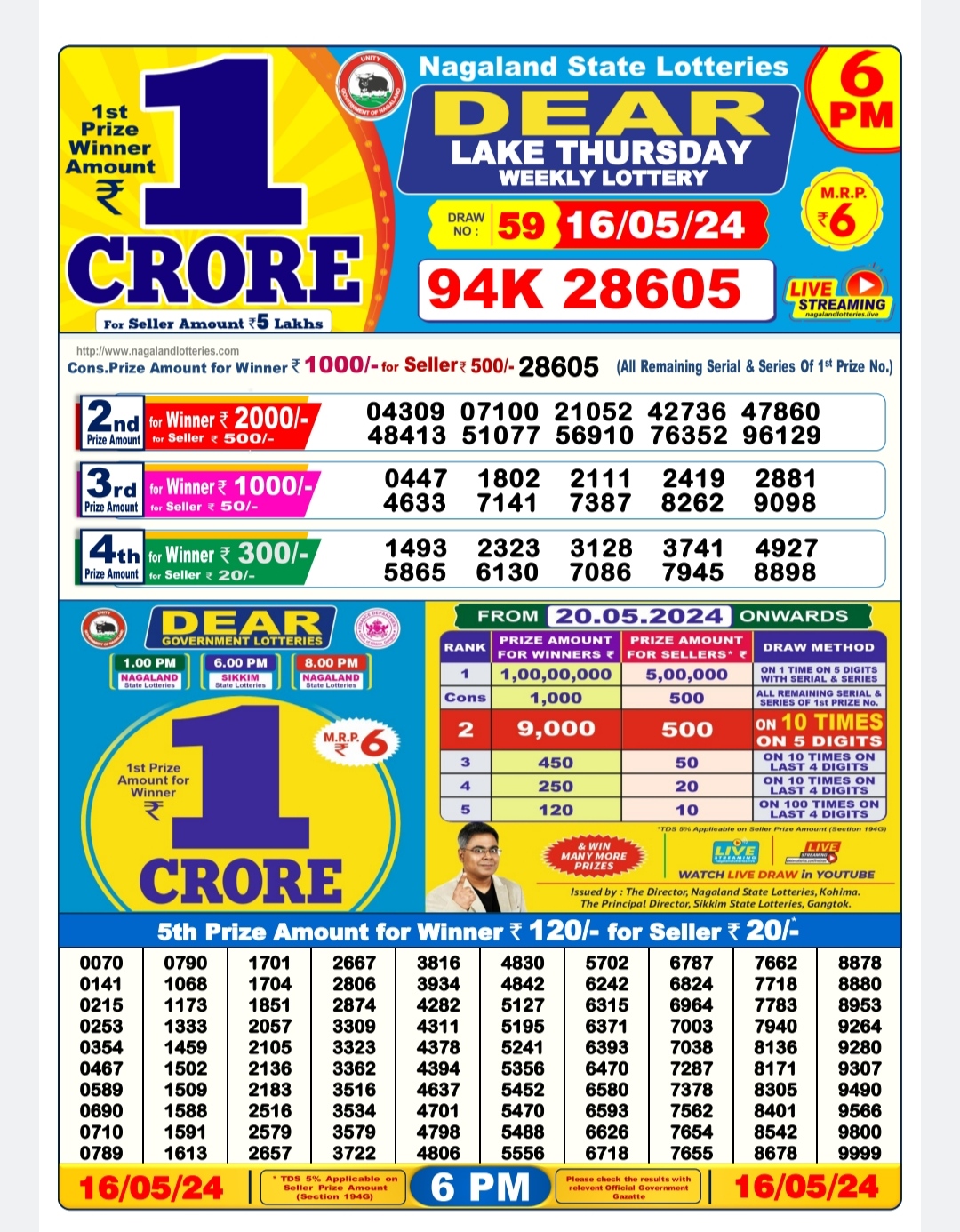 Dear lake Thursday weekly lottery 6pm result 16/05/24