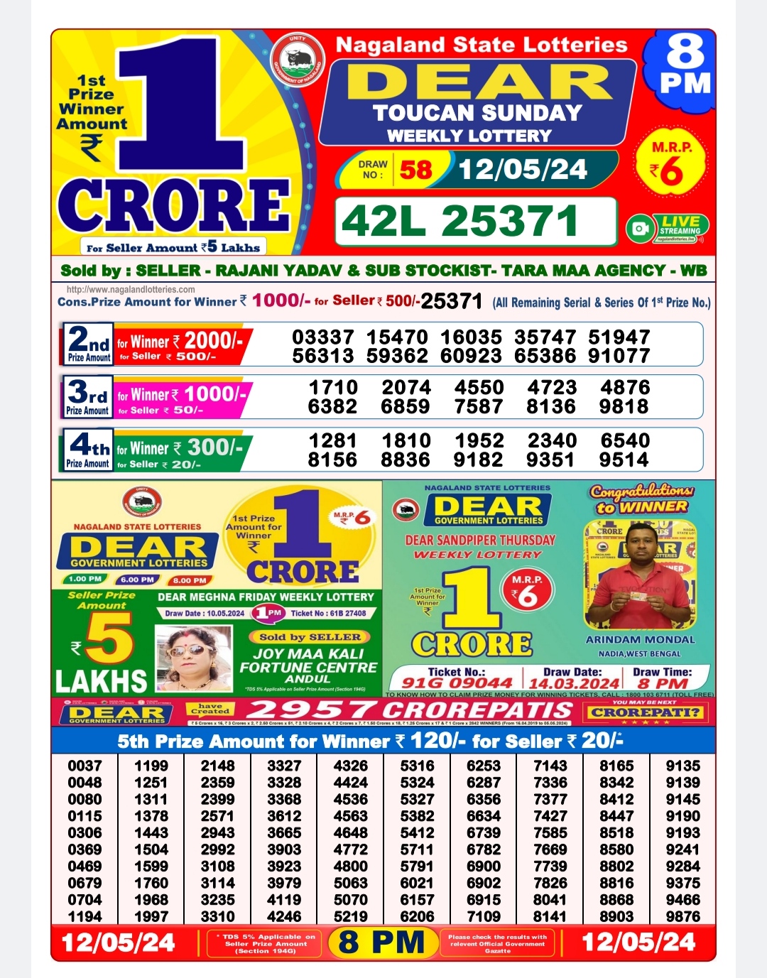 Dear10 wonder sunday weekly lottery 7pm result 12/05/24