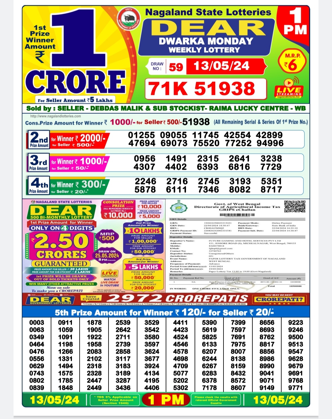 Dear dwarka monday weekly lottery 1pm result 13/05/24