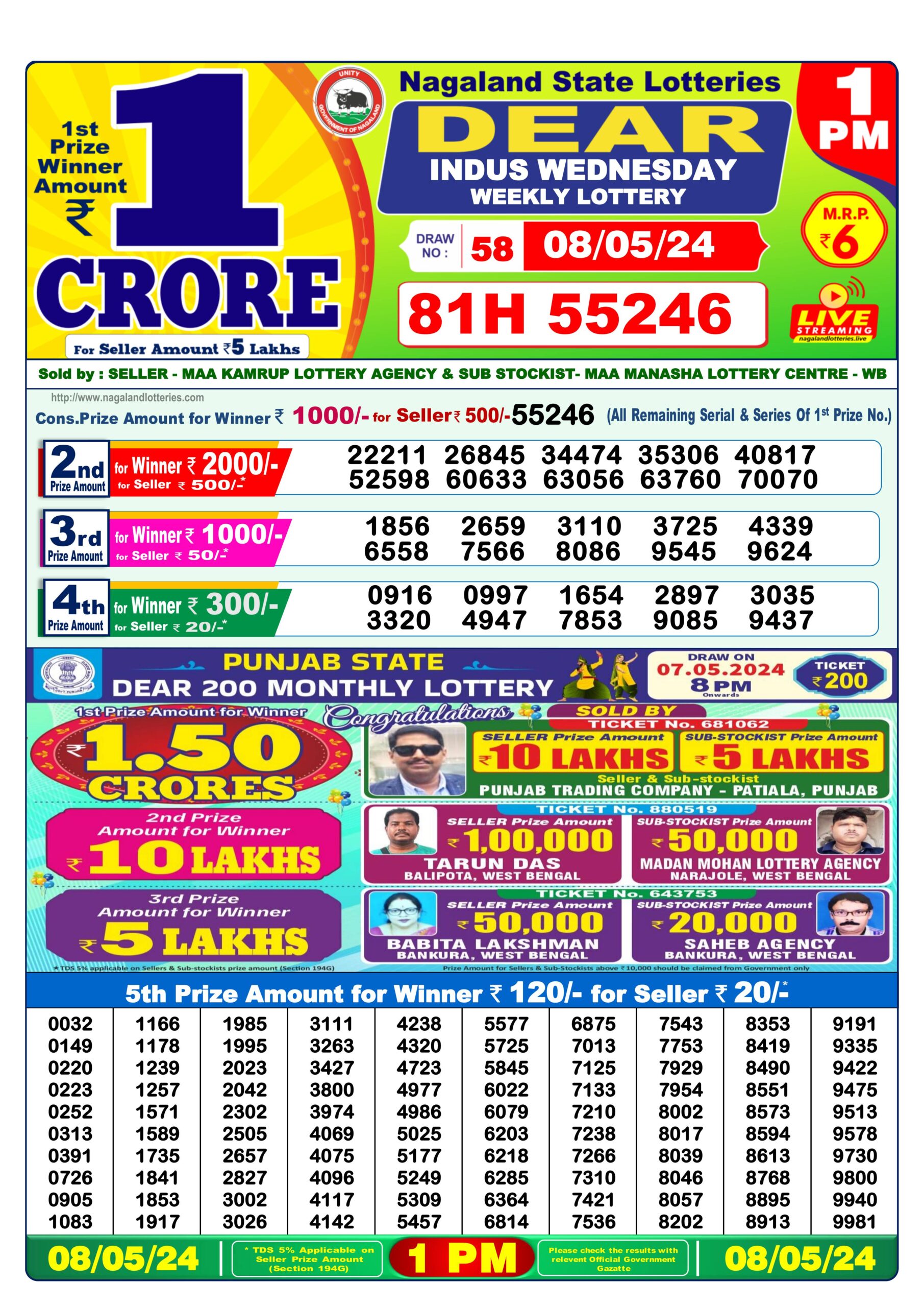 Dear indus Wednesday weekly lottery 1pm result 8/05/2024