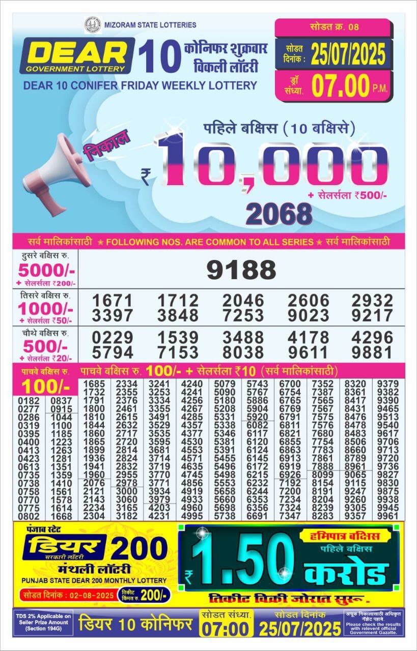 Dear 10 Lottery Result 25.07.25 Live | Check 7pm Winners
