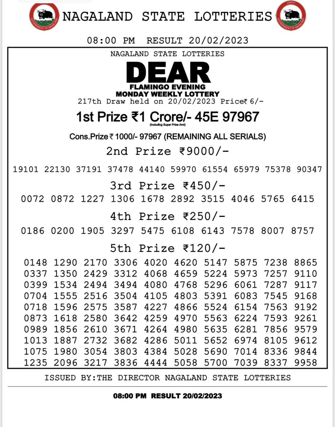 Dear daily lottery result 20 Feb 2023 8pm