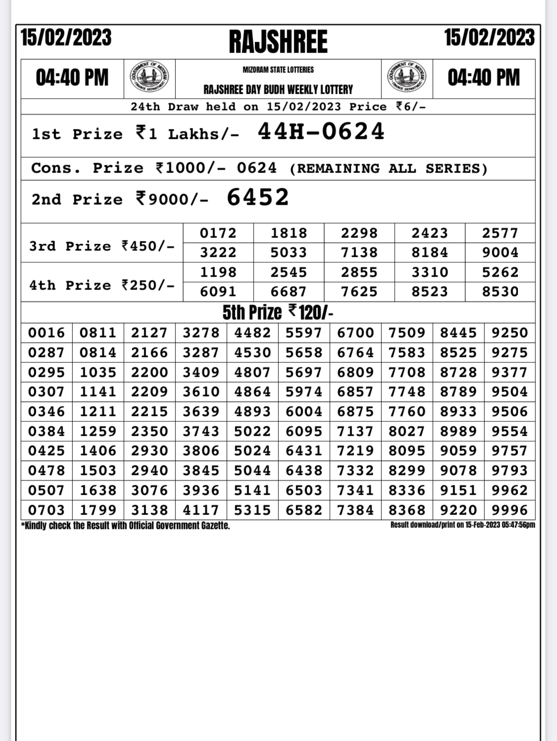 Rajshree daily lottery result 15feb 2023 4.40pm