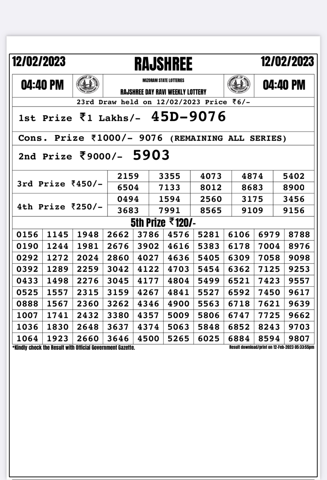 Rajshree Daily Lottery Result 12feb 2023 4.40pm