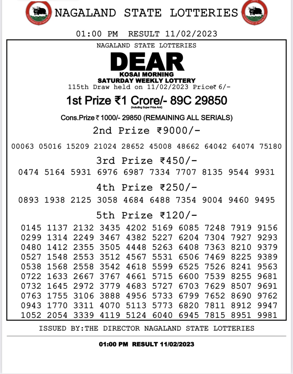 Dear Daily Lottery Result 11feb 2023 1Pm