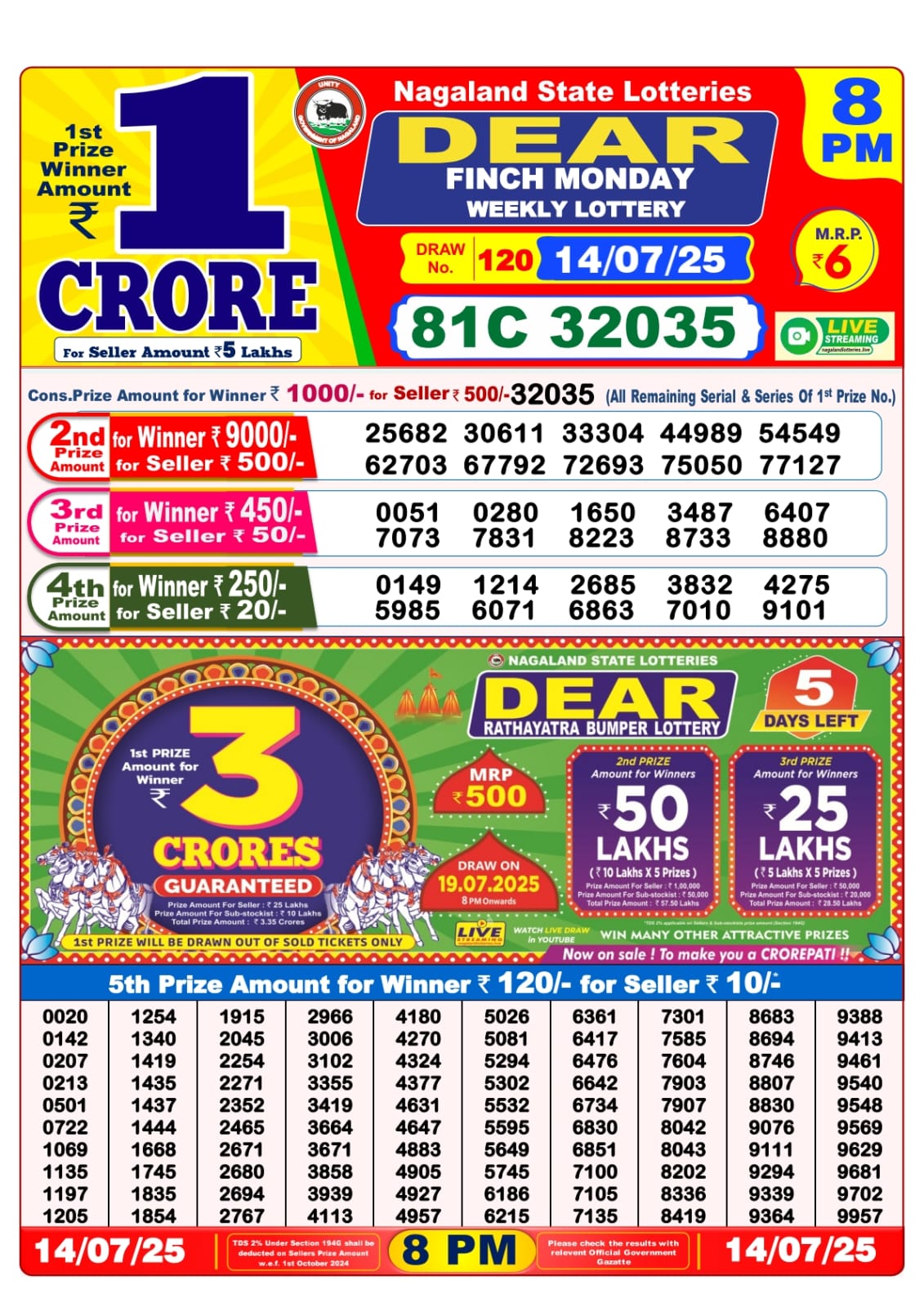 Dear Lottery Result 14.07.25 | 8 PM Live Lottery Sambad Result