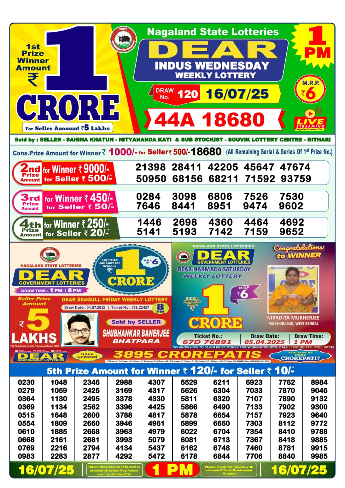 Dear Lottery Result Today 16.07.25 | Lottery Sambad 1PM Result