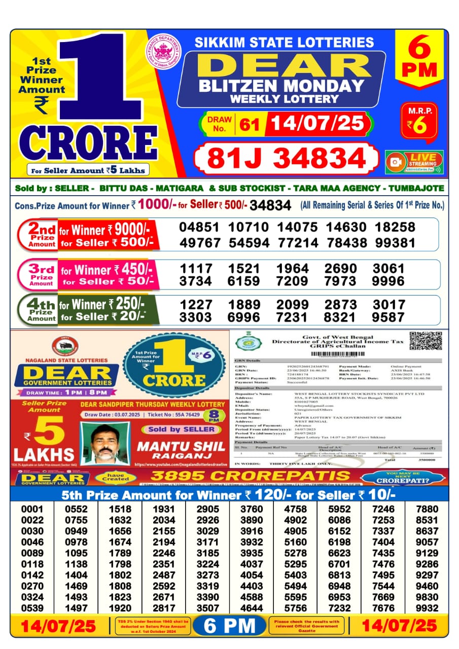 Dear Lottery Result Today 14.07.25 | Lottery Sambad 1PM Result