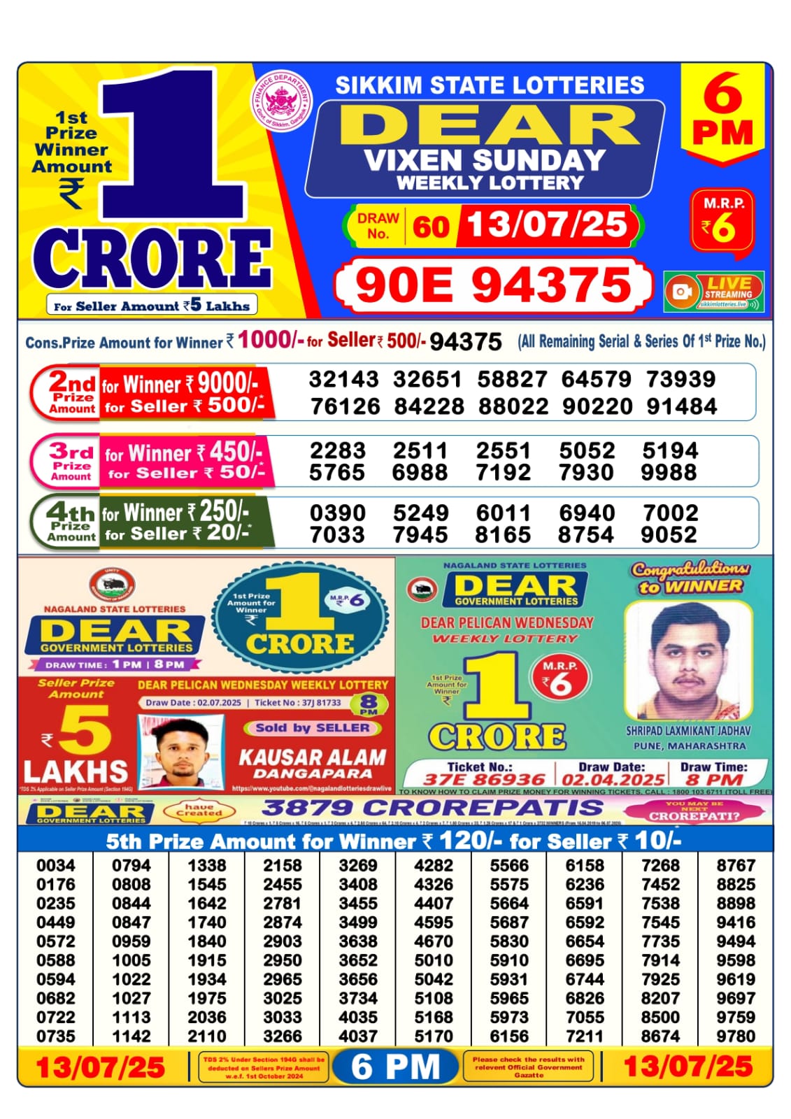 Dear Lottery Result Today 13.07.25 | Lottery Sambad 1PM Result