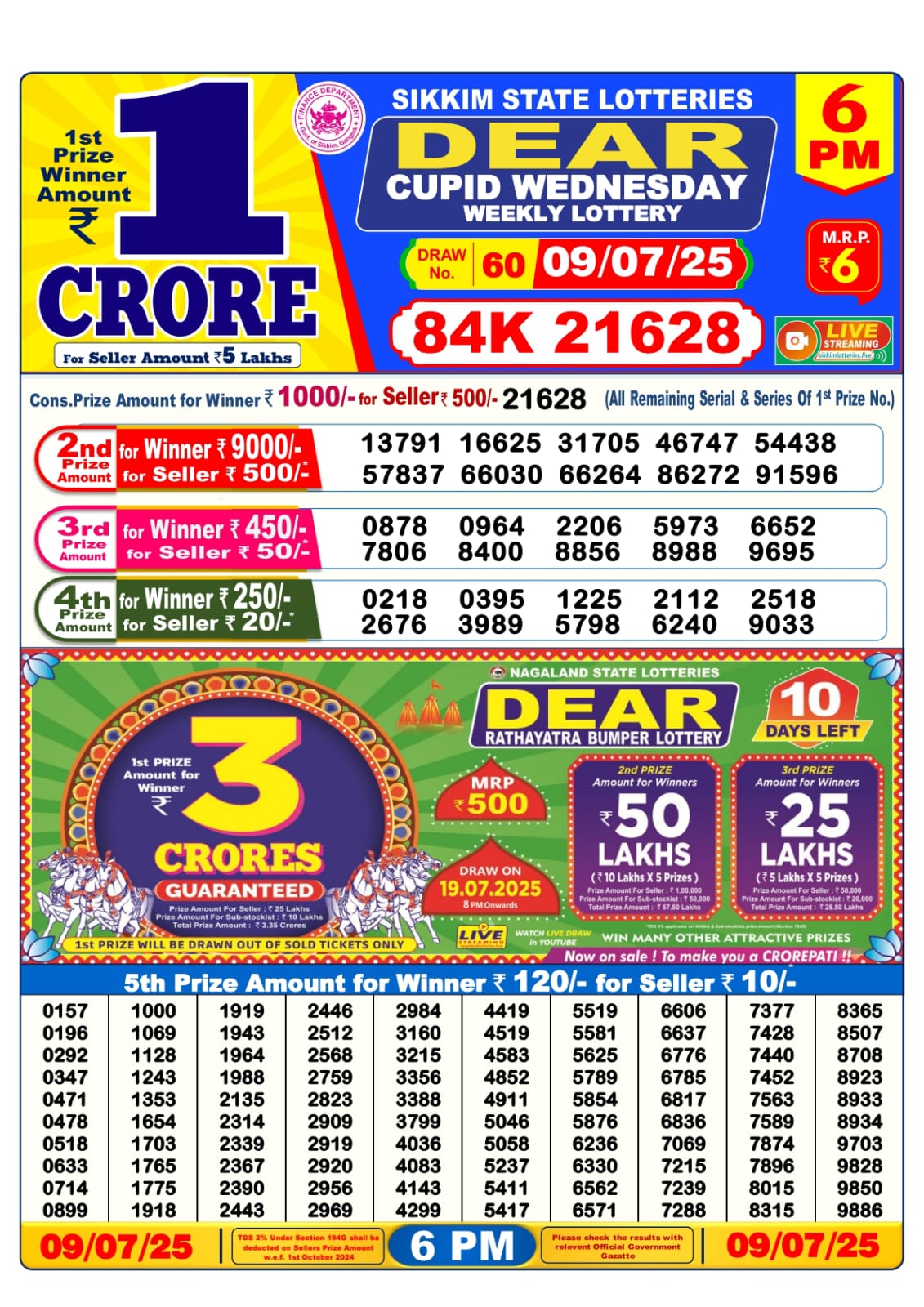 Dear Lottery Result Today 09.07.25 | Lottery Sambad 1PM Result
