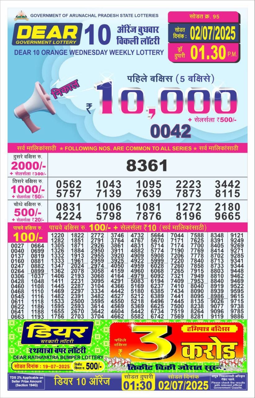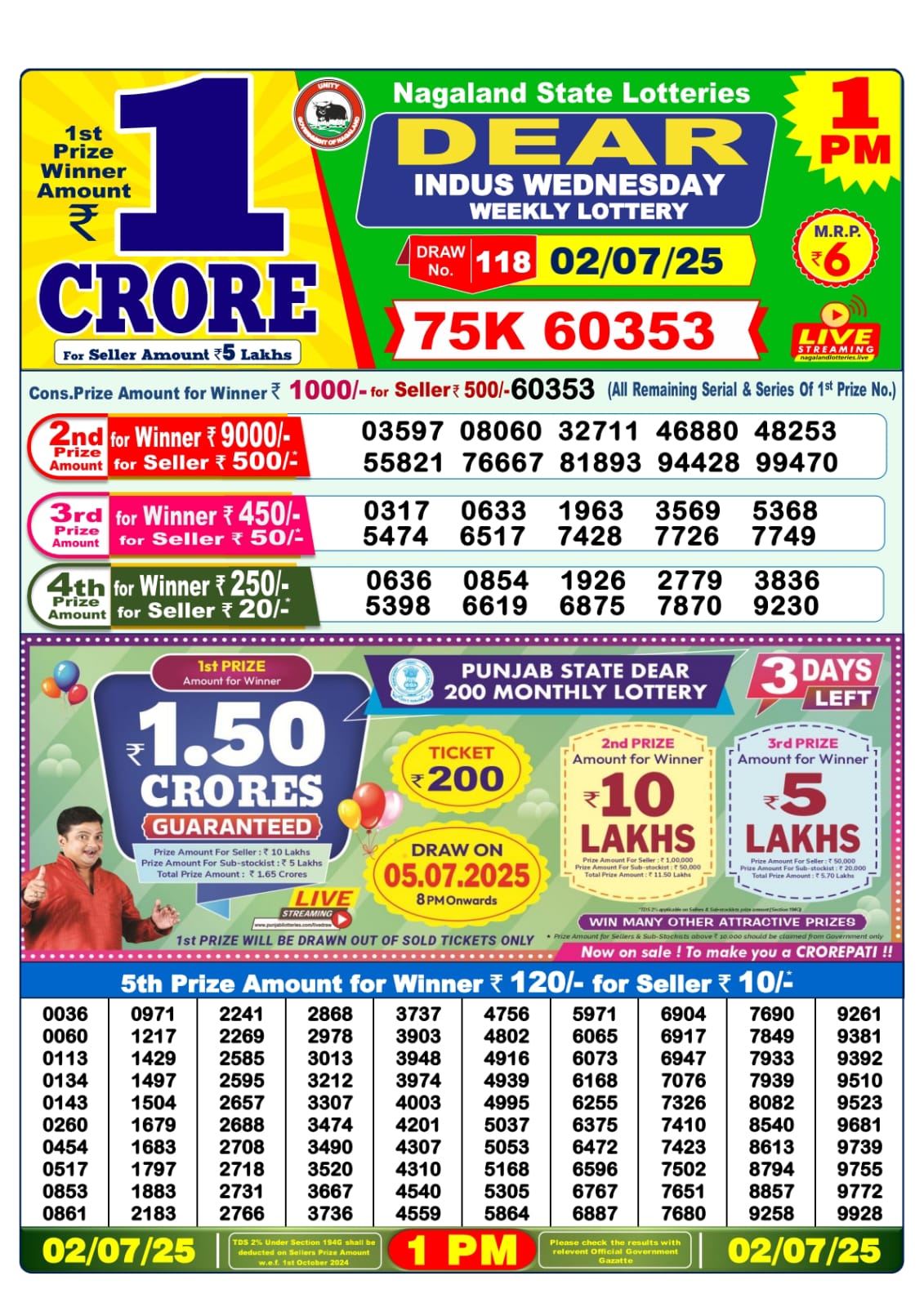 Dear 10 Lottery Result 02.07.25 Live | Check 7pm Winners
