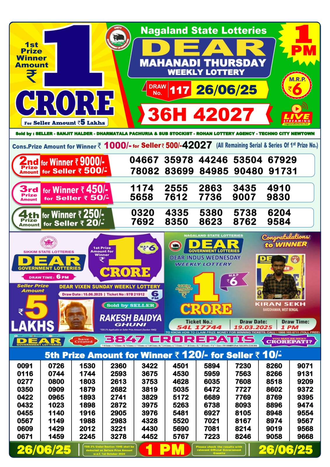 Dear Lottery Result Today 26.06.25 | Lottery Sambad 1PM Result
