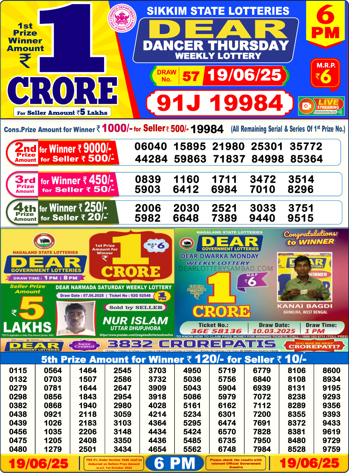 Dear Lottery Result 19.06.25 | 8 PM Live Lottery Sambad Result