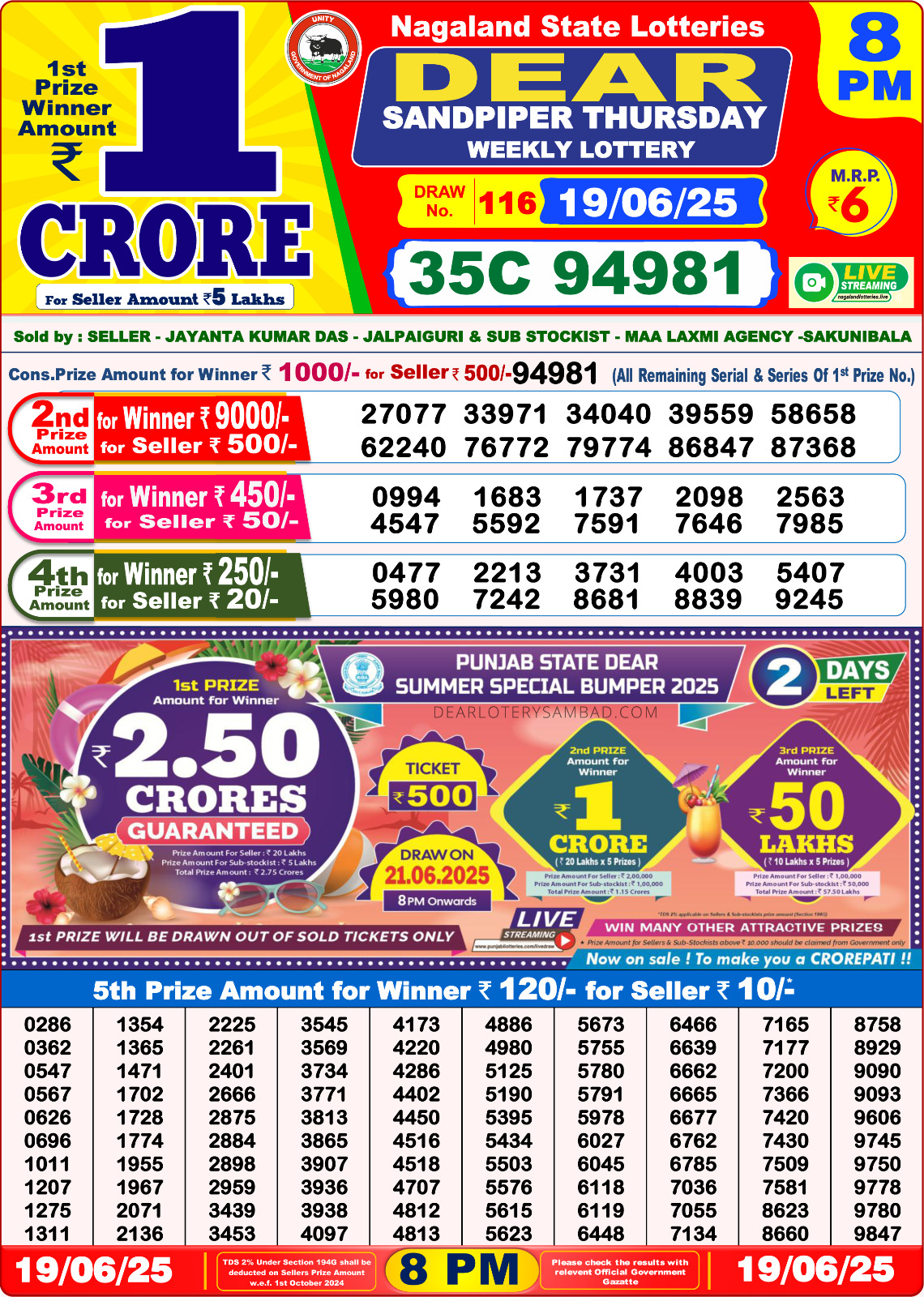 Lottery Sambad Today 19.06.25 | Dear Lottery 6 PM Result Live