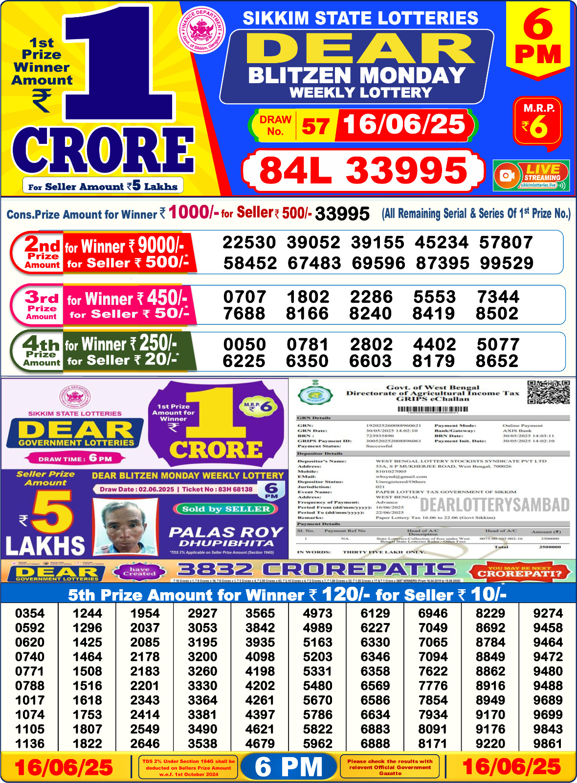 Lottery sambad  Dear super 7PM Result 16-06-25