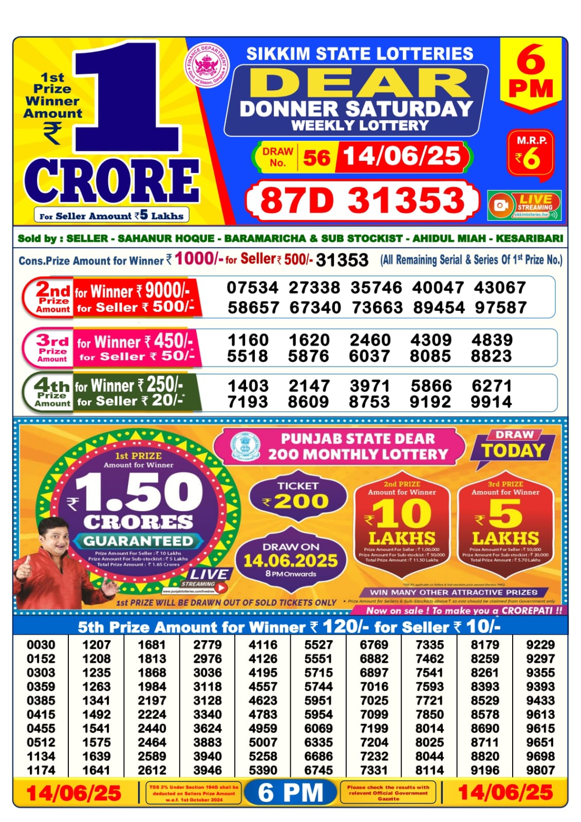 Lottery sambad  Punjab 6PM Result 14-06-25