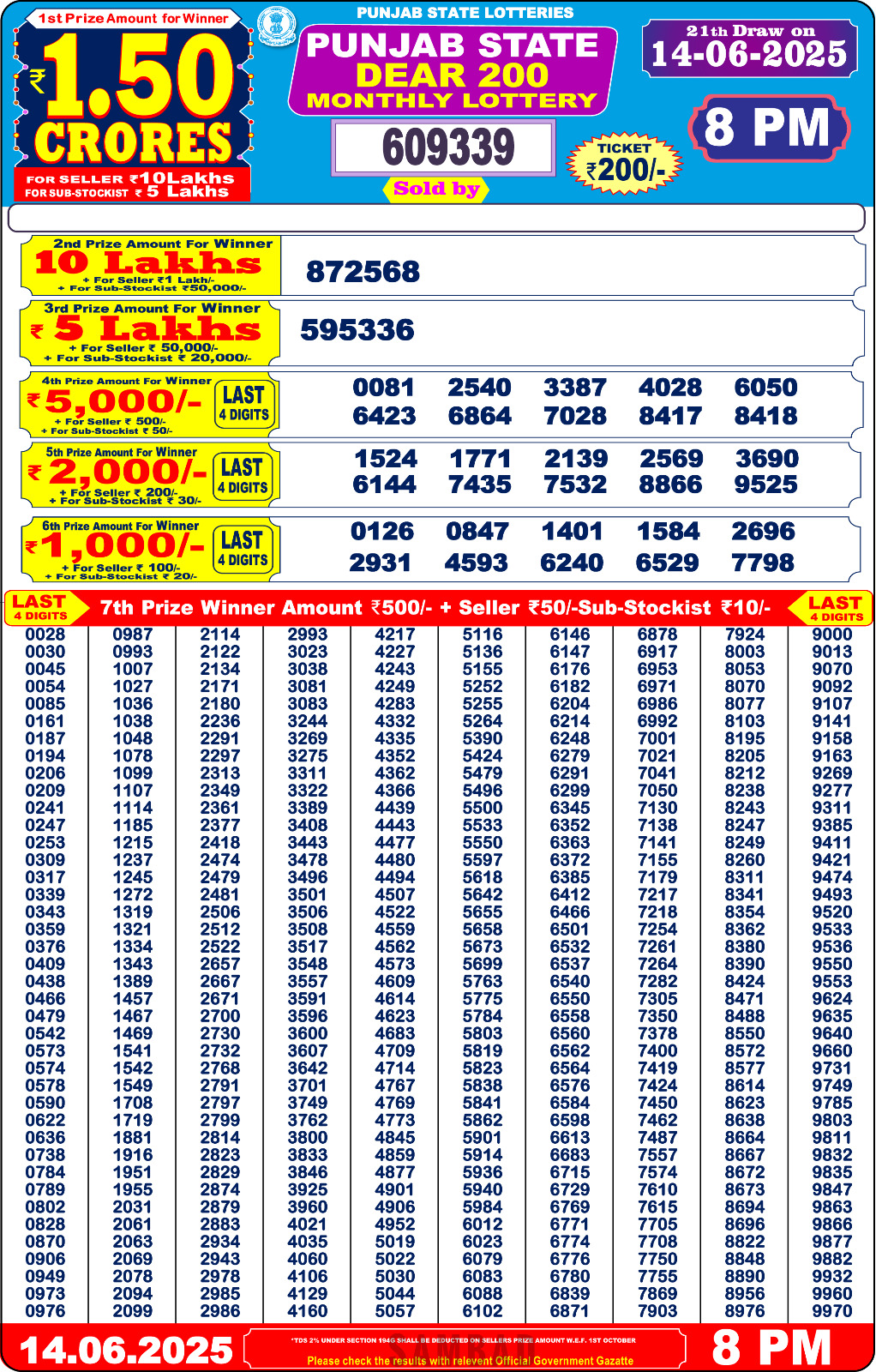 0 Comment on Punjab dear 200 monthly lottery result 14/06/25 live