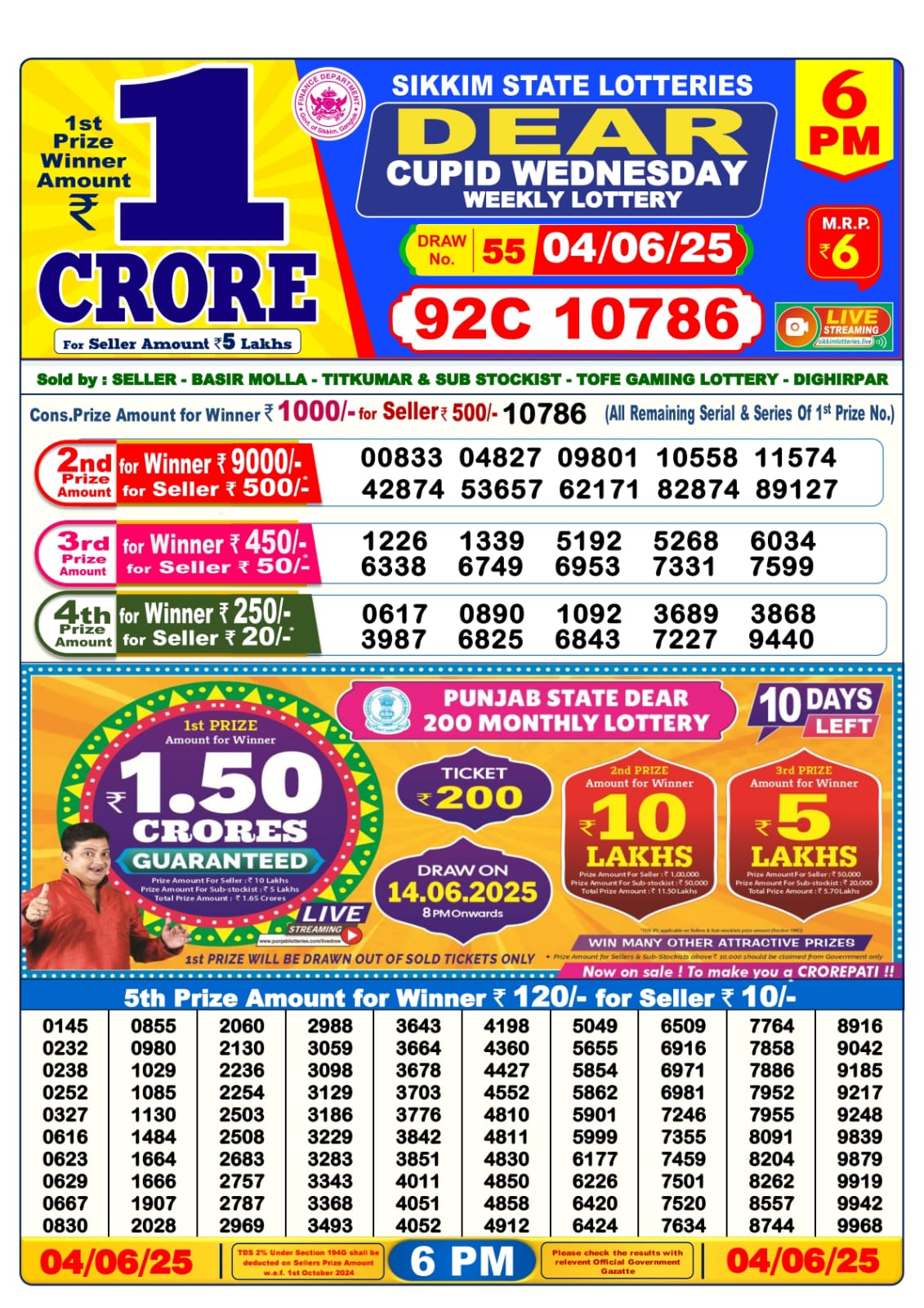Lottery sambad  Punjab 6PM Result 04-06-25