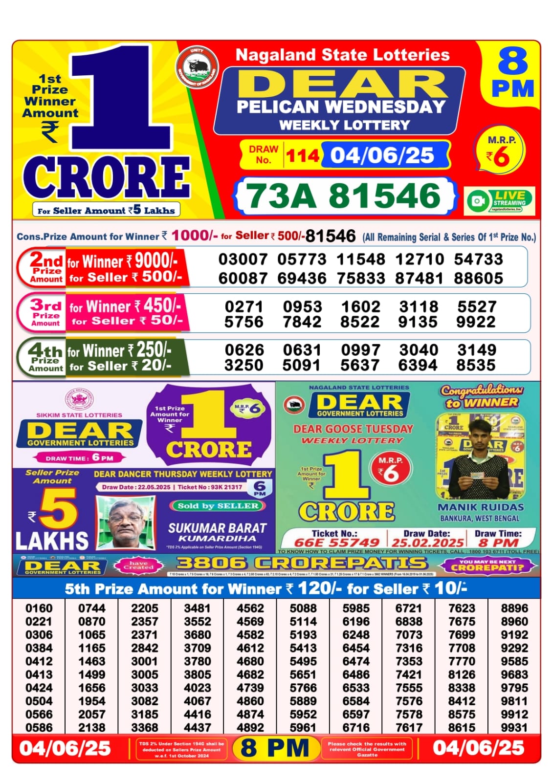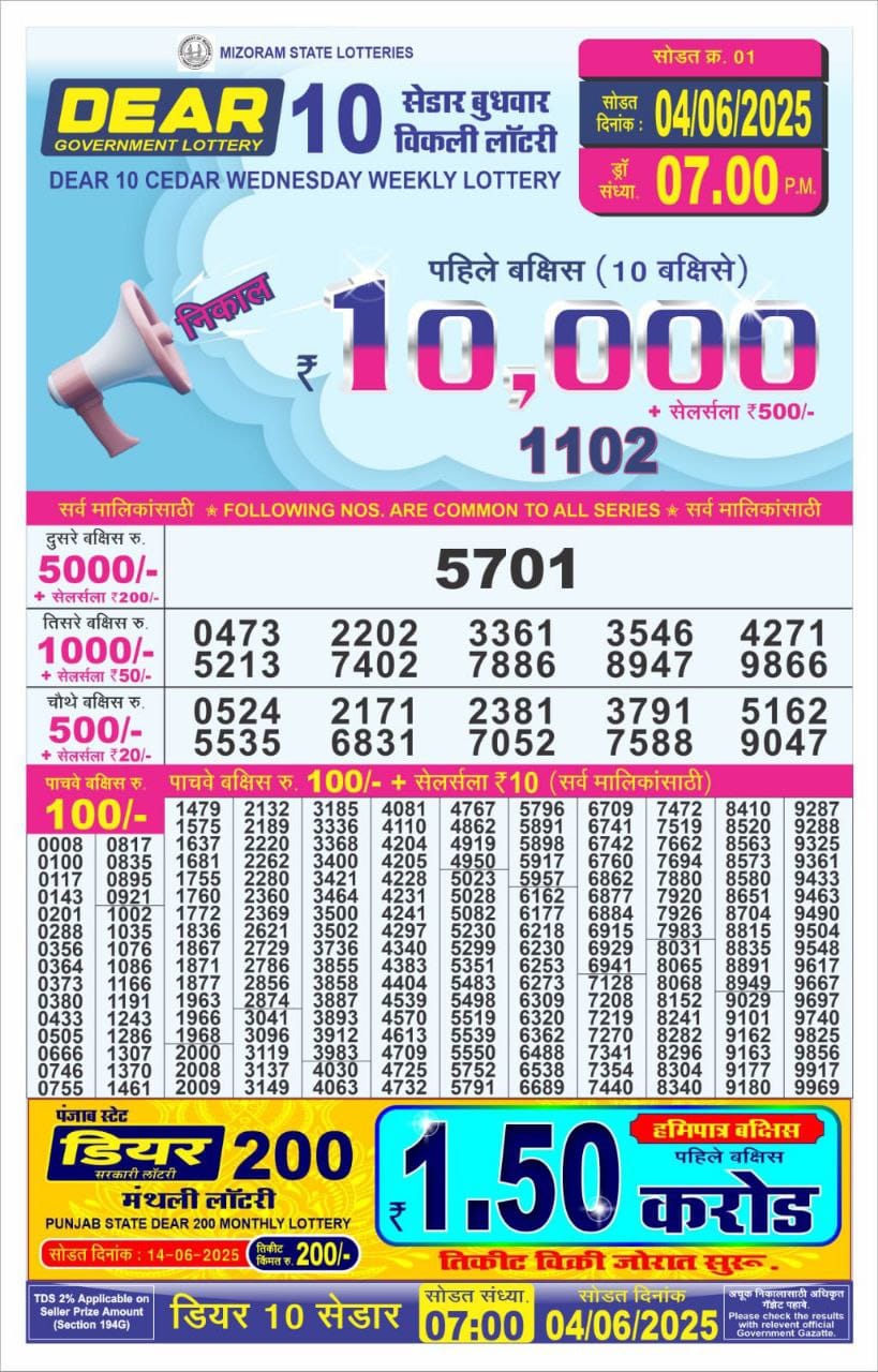 Lottery sambad  Dear 10 7PM Result 04-06-25