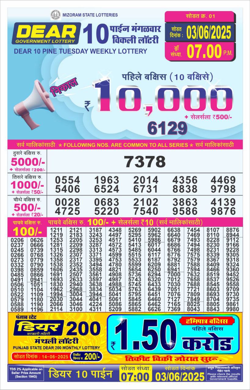 Lottery sambad  Dear 10 7PM Result 03-06-25