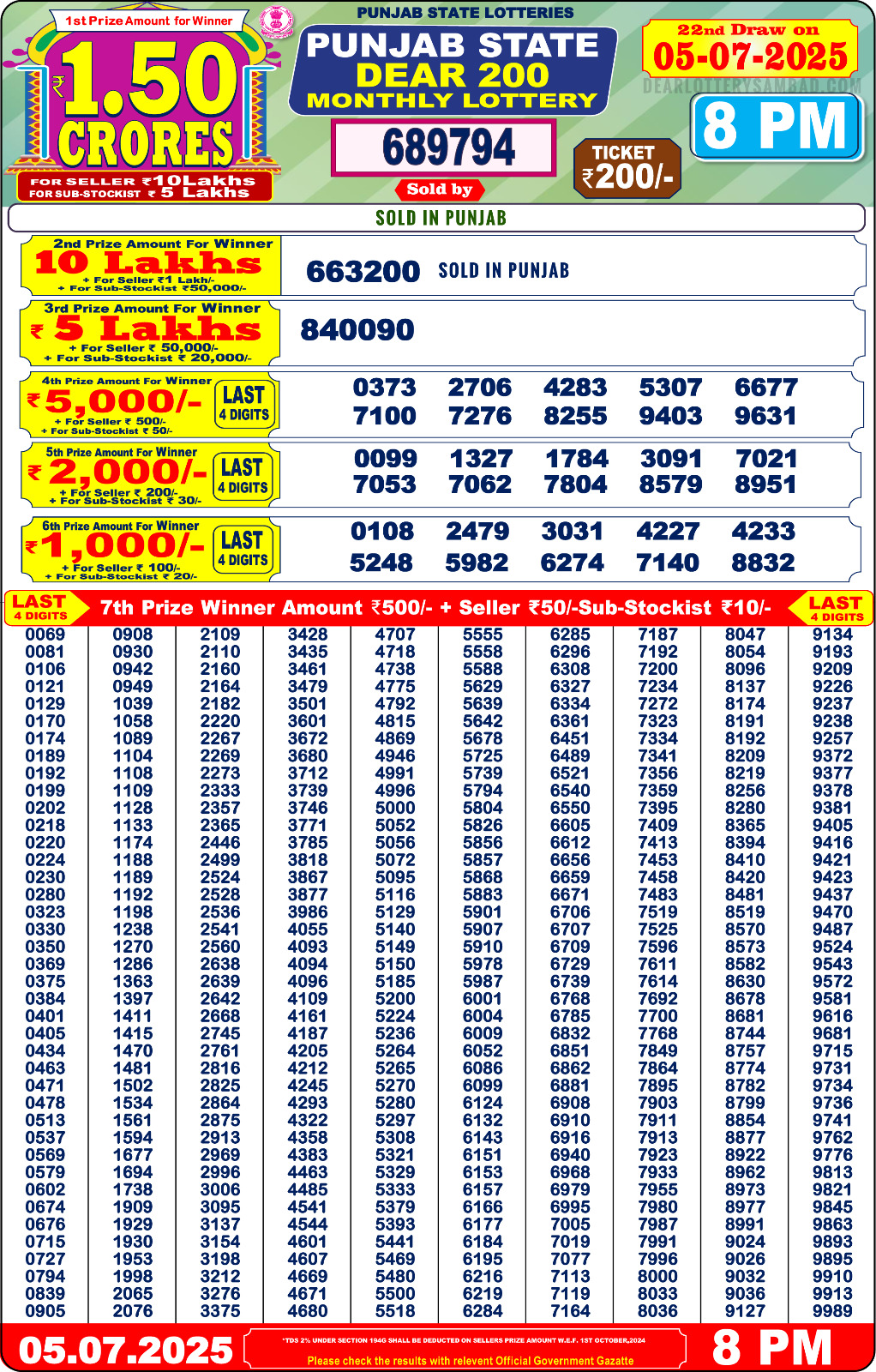 Results for 8 PM draw of Dear Lucky weekly lottery 05.07.25 are being announced. Full result will be available shortly on this page.