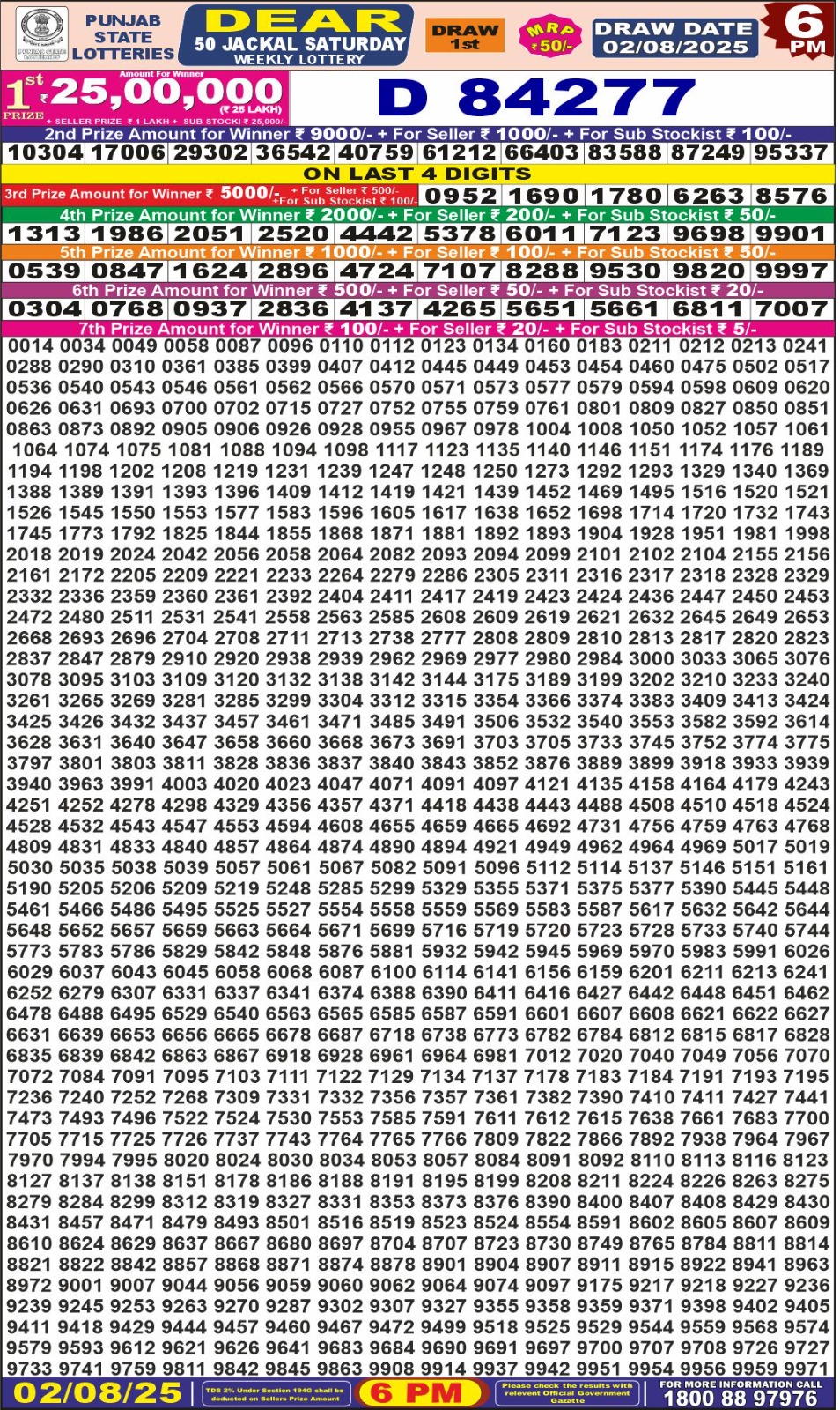 Punjab State Dear 50 Lottery Result 02.08.25 | Full Prize List Today 6pm 02-08-2025 Leave a Comment on Punjab State Dear 50 Lottery Result 02.08.25 | Full Prize List Today 6pm