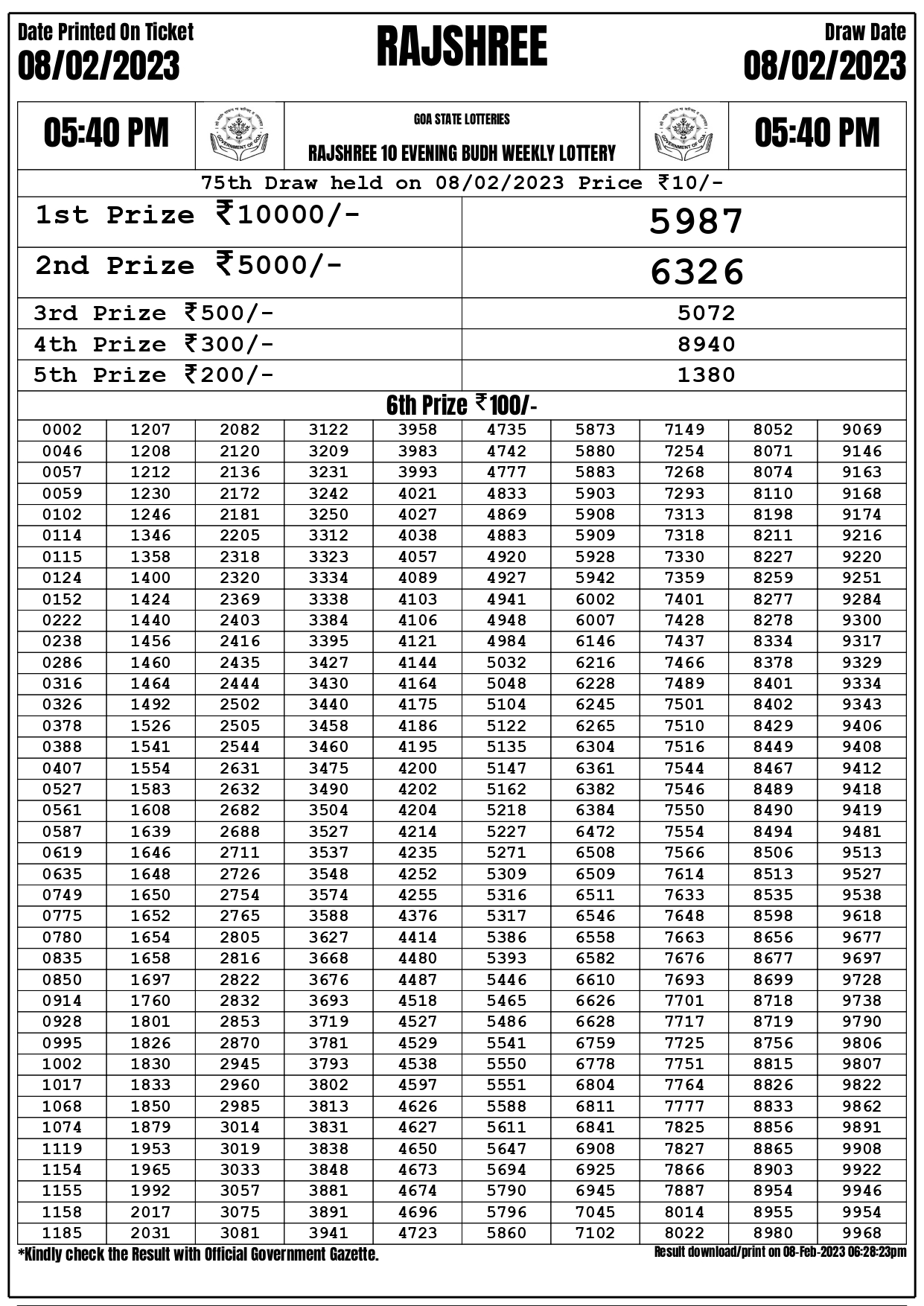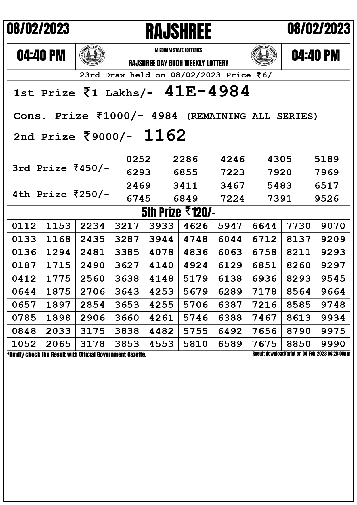 Rajshree Daily Lottery Result 9feb 2023 4.40PM
